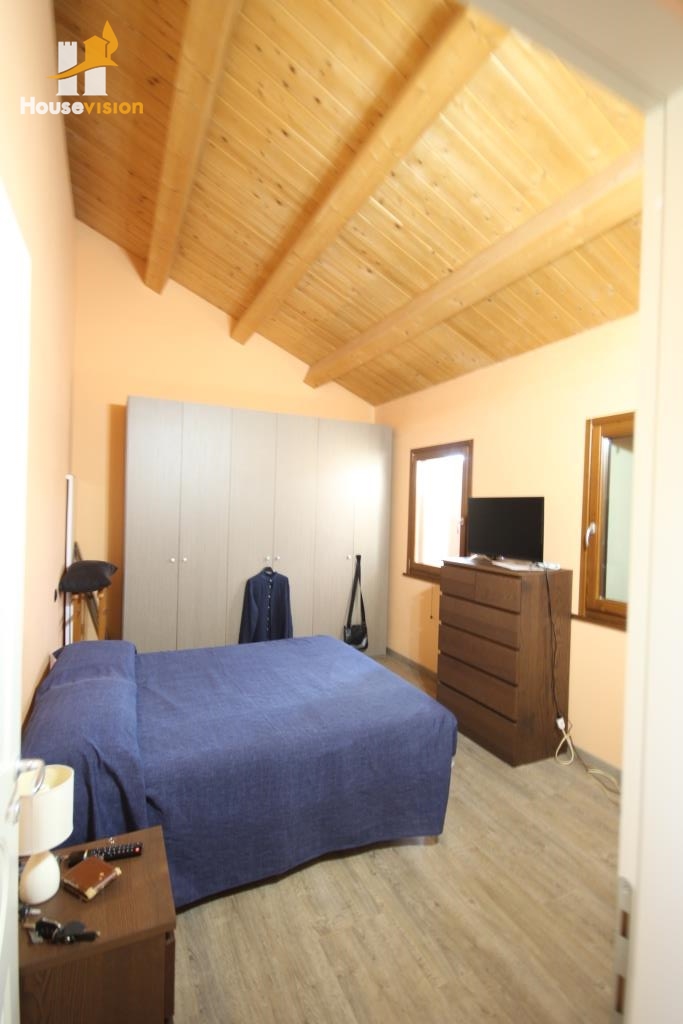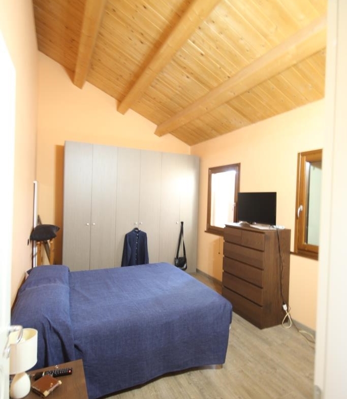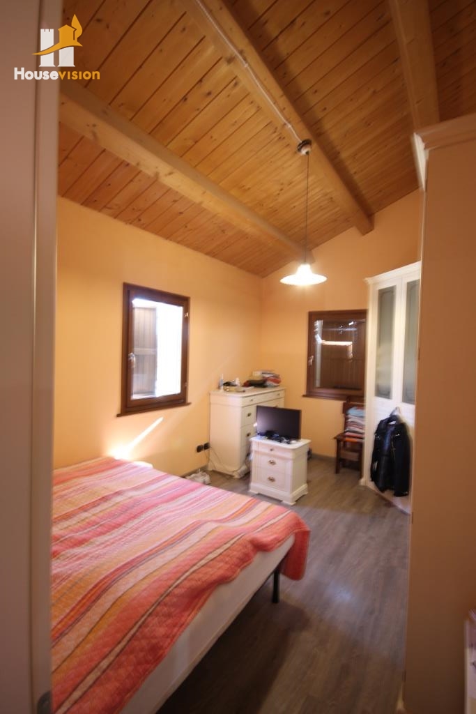 An external staircase leads up to the first floor, where the entrance hall opens onto the living room-dining room-kitchen. To the right and left of the living area are four large bedrooms, two bathrooms and a study. The intermediate and top floors are wooden, as are the doors and double-glazed windows.